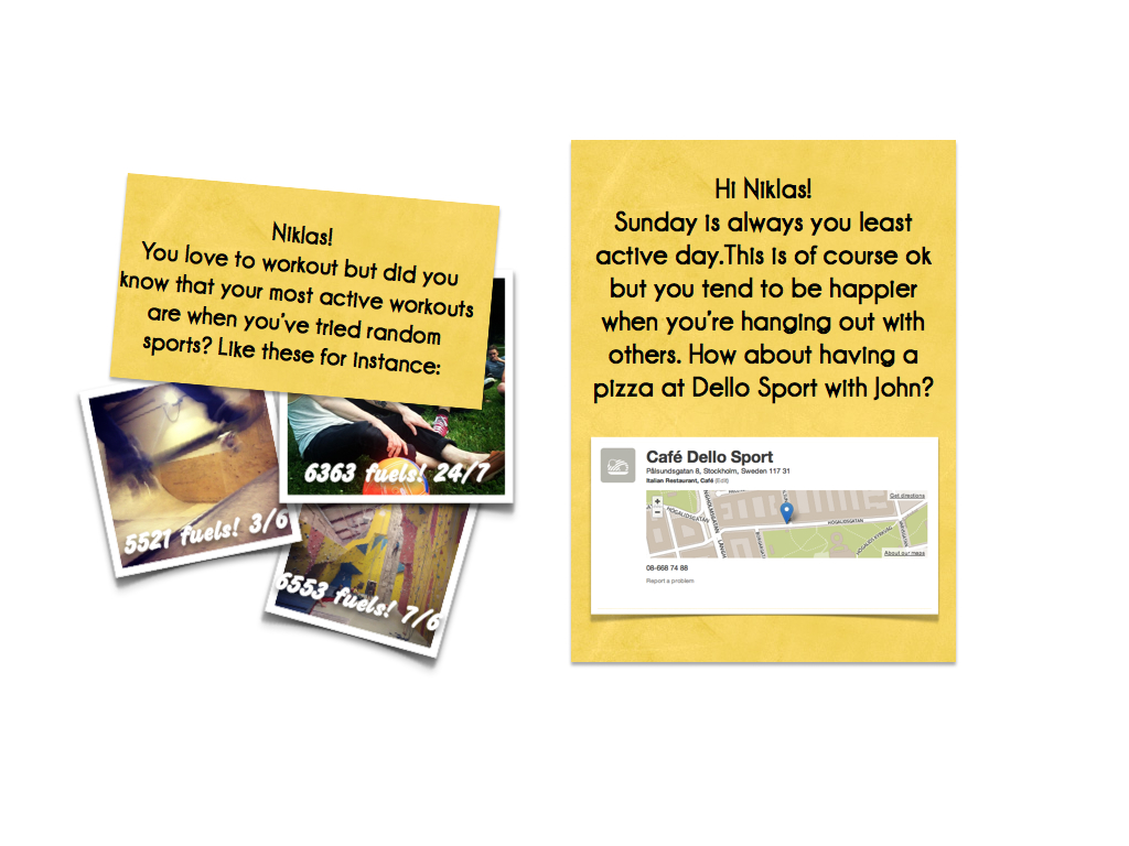 Ovan ser du min data från Nike Fuelband till vänster och den samlade datan från de flesta tjänster jag använder inom social media från de senaste 90 dagarna. Just Fuelbandet är något vi skrivit om tidigare. För oinsatta kan bandet beskrivas som en sorts stegräknare från framtiden. Fuelbandet samlar helt enkelt in hur mycket jag rör på mig. Datan till höger är en sammanställning av min aktivitet på de fyra tjänsterna vars logotyper ni ser under grafen – Facebook, Foursquare, Instagram och Twitter.