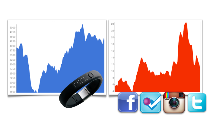 Ovan ser du min data från Nike Fuelband till vänster och den samlade datan från de flesta tjänster jag använder inom social media från de senaste 90 dagarna. Just Fuelbandet är något vi skrivit om tidigare. För oinsatta kan bandet beskrivas som en sorts stegräknare från framtiden. Fuelbandet samlar helt enkelt in hur mycket jag rör på mig. Datan till höger är en sammanställning av min aktivitet på de fyra tjänsterna vars logotyper ni ser under grafen – Facebook, Foursquare, Instagram och Twitter.