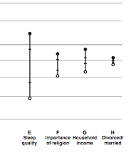 Stapeln för sömn visar sambanden mellan sex eller färre timmars sömn per natt och sju eller fler timmars sömn per natt med välmående dagen efter. Stapeln för inkomst visar sambanden mellan självskattad lycka en vanlig dag för personer med en månadslön på 15000 kr och personer med en månadslön på 45 000 kr. Siffrorna är från USA och är givetvis svåra att översätta rakt av till svenska förhållanden, men psykologiforskaren Norbert Schwartz, som tillsammans med Daniel Kahneman ligger bakom studien, sammanfattar det bra i följande kommentar till Psykologifabriken: