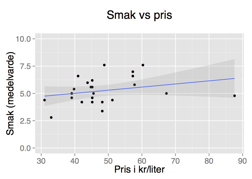 Om man bortser från Chimay som var skitdyr men inte så god – en så kallad outlier som du ser längst till höger i grafen ovan – så var sambandet mellan pris och smak dock signifikant.