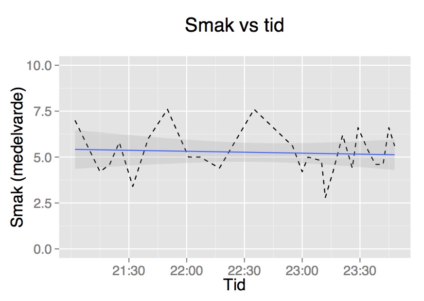 Jag sammanfattade mina vänners skattningar med medelvärden och testade om det fanns något samband mellan tidpunkten då ölen dracks och smakupplevelsen. Det fanns det inte (r = 0,08; p = 0,71). På grafen nedan syns medelvärdena förbundna med en streckad linje. Den blå regressionslinjen visar att sambandet var nästintill obefintligt. Ölen blir alltså varken godare eller äckligare ju mer man har druckit…