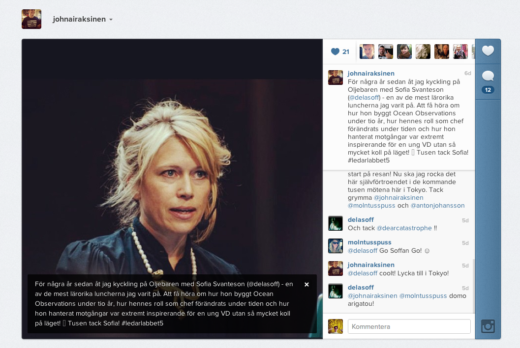 Slutligen kunde jag inte låta bli att lägga upp VD-Johns bild på Sofia Svantesson, grundare av Oceans Observations. Sofia föreläste bland annat på vårt event Health Hack Day förra året och av kommentarerna på instagram att döma så har hon inspirerat betydligt fler än bara mig och John. Bilden var en del av ett uppdrag i Ledarlabbet, där John coachar men också passar på att göra en del av utmaningarna!